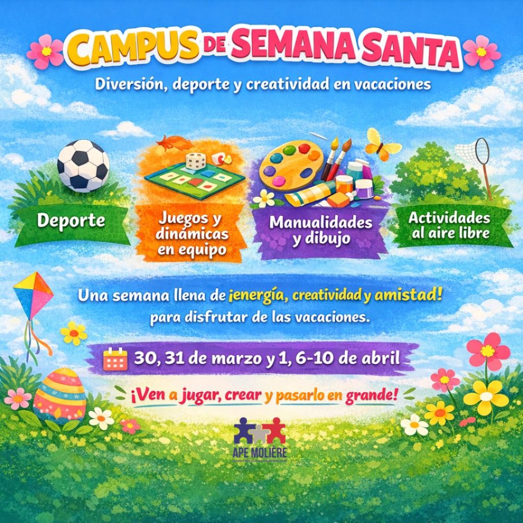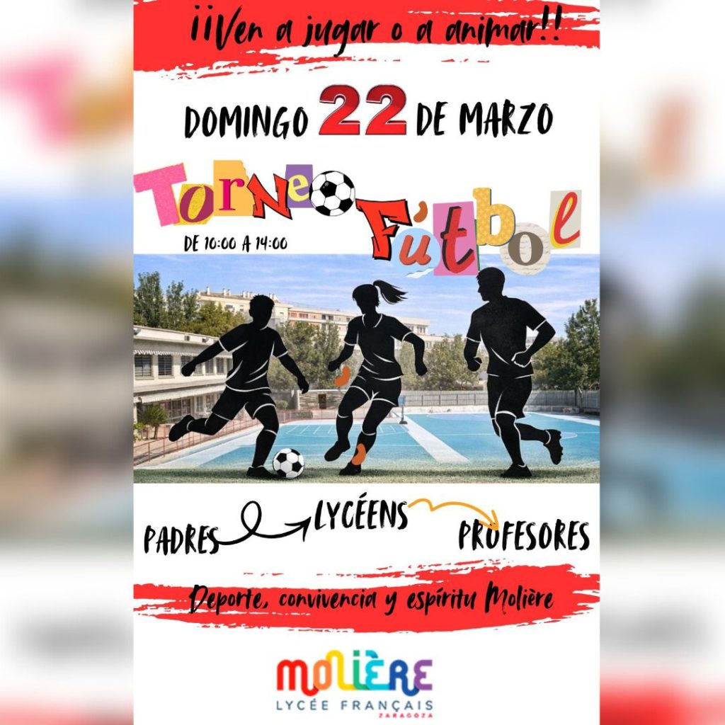 “Ponte en mi lugar” ¿Seremos capaces de  jugar ⚽ con el mismo entusiasmo que nuestros hij@s? ¿ Serán ellos capaces de mostrar ese apoyo incondicional desde la grada?  Inscribid vuestros equipos de madres y padres y participad en el torneo de fútbol Molière el domingo 22 de 10.00 a 14.00 horas que están organizando profesorado y alumnos de secundaria.  ¡Os esperamos a todos en esta jornada de convivencia y deporte!  …