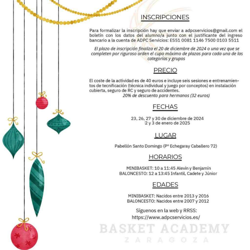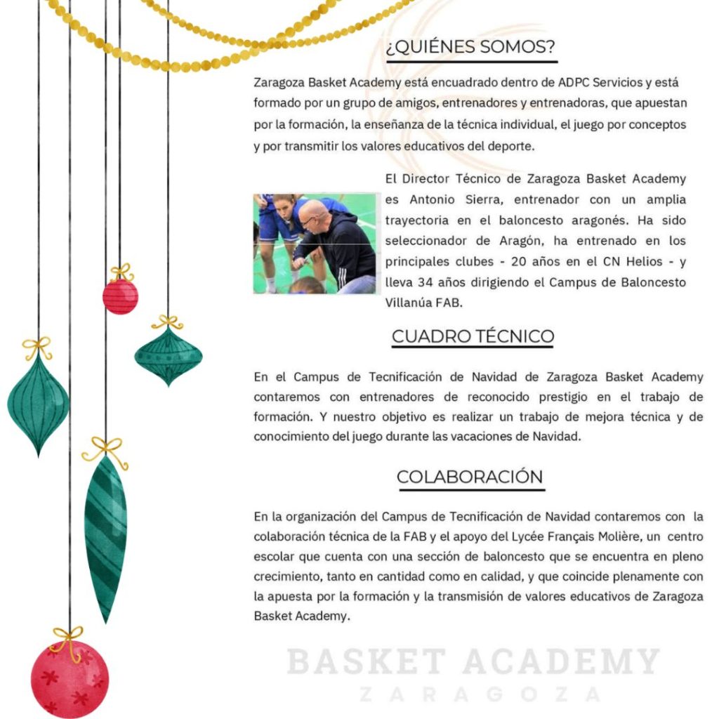 La actividad está dirigida a chicos y chicas de todos los niveles nacidos entre los años 2007 y 2016, que deseen realizar un trabajo de mejora técnica y conocimiento del juego durante las fiestas navideñas en grupos de edad y nivel similar. Con entrenadores de reconocido prestigio en el trabajo de formación bajo la dirección técnica de Antonio Sierra, quien cuenta con un amplia trayectoria en el baloncesto aragonés.